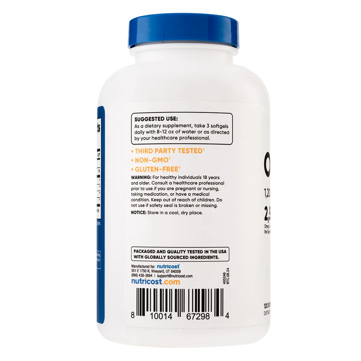El Aceite de Pescado Omega-3 2,500 mg de Nutricost es un suplemento nutricional formulado para aportar ácidos grasos esenciales EPA (ácido eicosapentaenoico) y DHA (ácido docosahexaenoico), conocidos por su papel fundamental en diversas funciones del organismo.