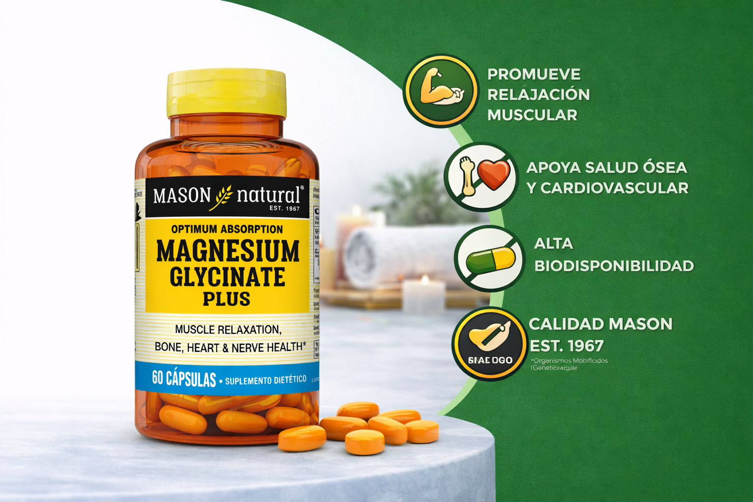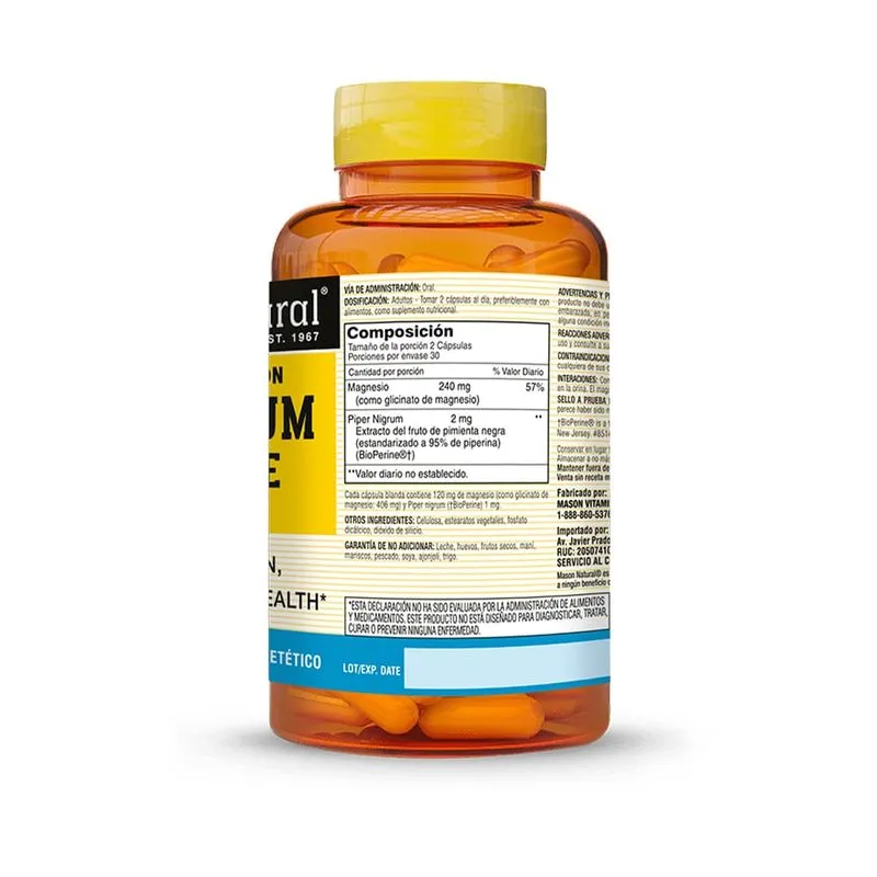 Glicinato de Magnesio 240 mg con Bioperine – 60 Cápsulas | Mason Natural