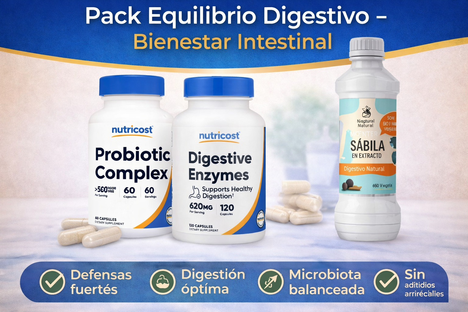 El Pack Equilibrio Digestivo combina tres suplementos utilizados para apoyar la salud digestiva y el bienestar gastrointestinal.